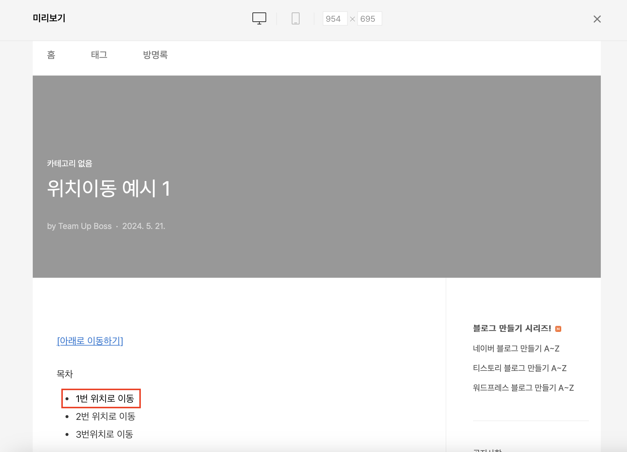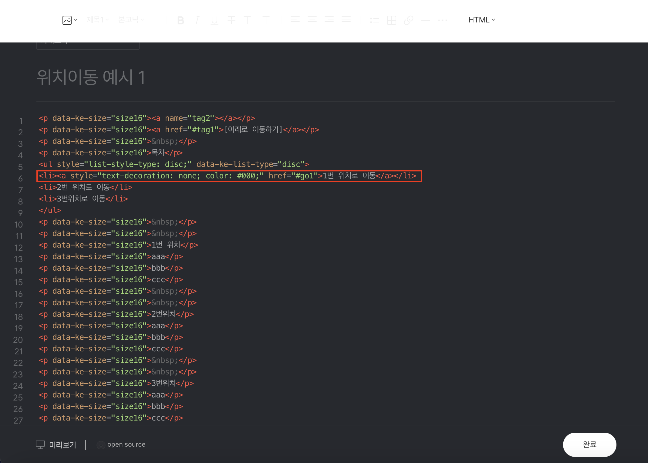 여기까지 잘 이해 하셨다면 이제 html을 사용해서 게시글 내에서 위치를 이동시키는 기능을 마음껏 사용하실 수 있습니다.
