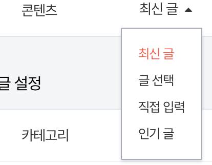 나중에 SEO(검색엔진 최적화)를 위해 자주 들어오게 될 것입니다. 여기서 홈 설정을 보면 최신글과 커버가 있는데 내 블로그 홈 화면에서 보여지는 글을 설정 할 수 있습니다. 커버 아이템을 추가 및 삭제하는 것으로 블로그 외관 분위기를 크게 바꿀 수 있습니다. 여기서 아이템 종류를 설정 할 수 있고 아이템에 들어갈 글 종류나 카테고리도 설정이 가능합니다.