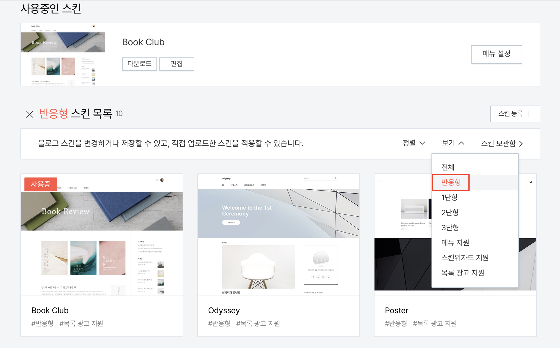 기본적으로 티스토리는 40여 종이 넘는 다양항 스킨을 제공합니다. 그 중 반응형 스킨을 설정하는 것을 추천드립니다. 반응형 스킨은 PC와 모바일에서 레이아웃을 환경에 맞게 자동으로 변형해서 블로그를 보여줍니다. 사실 스킨은 티스토리 블로그를 처음 만들때 설정 할 수 있기 때문에 이미 스킨을 설정하셨을 것입니다. 하지만 일반 스킨을 설정하셨다면 반응형으로 바꾸는 것을 추천드립니다. 최근 사용자는 대부분 PC가 아닌 모바일 환경에서 글을 읽기 때문입니다.