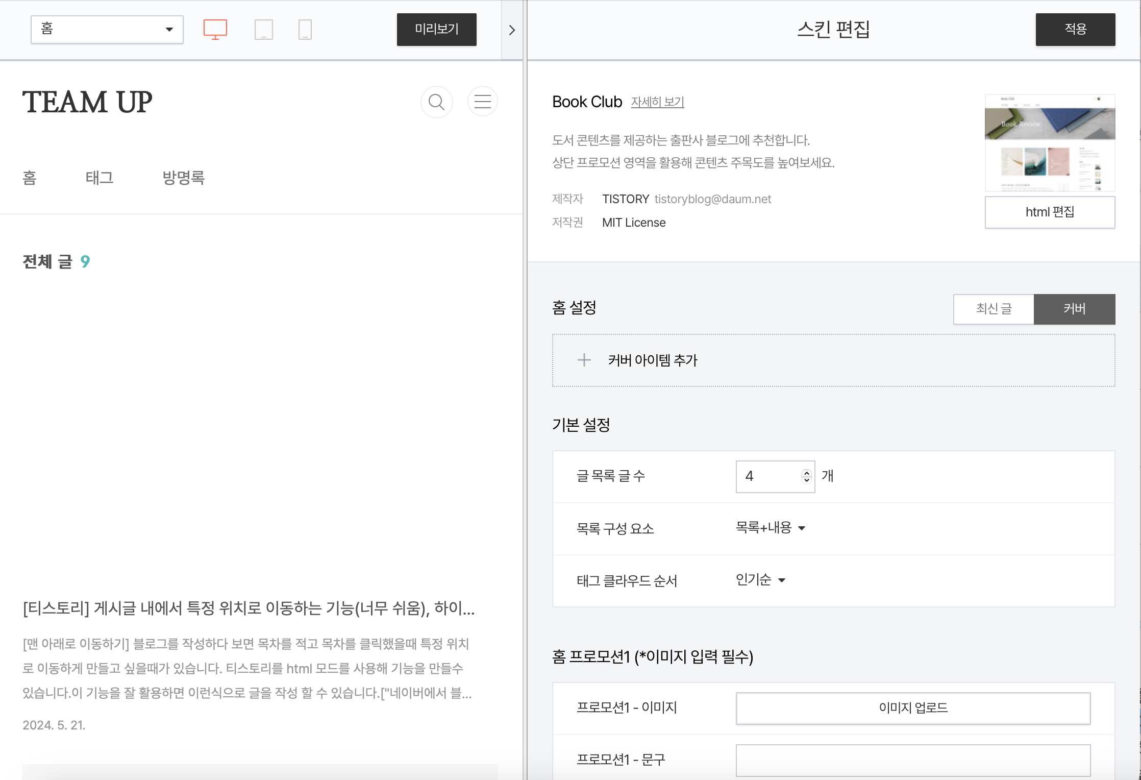 이제 기본적인 세팅을 완료했습니다. 이제 블로그를 운영하시면서 마음에 들지 않거나 변경을 원하는 부분을 바꾸면서 내 블로그를 성장시키면 됩니다.